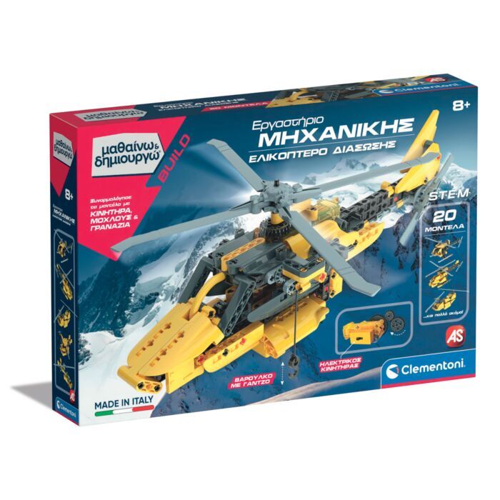 Ένα επιστημονικό σετ που θα σε κάνει να ζήσεις απίστευτες περιπέτειες με το Ελικόπτερο Διάσωσης του Μαθαίνω και Δημιουργώ. Ένα συναρπαστικό σετ με περισσότερα από 250 εξαρτήματα για την κατασκευή ενός μηχανοκίνητου ελικοπτέρου και 20 ακόμα μοντέλων και τεχνικών εφαρμογών. Πολλά εξαρτήματα όπως γρανάζια, σύνδεσμος καρντάν, ρότορες κτλ.