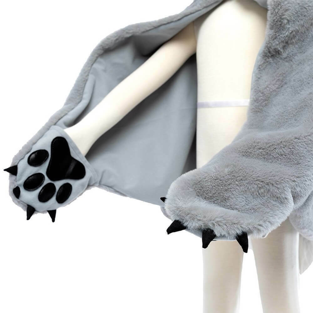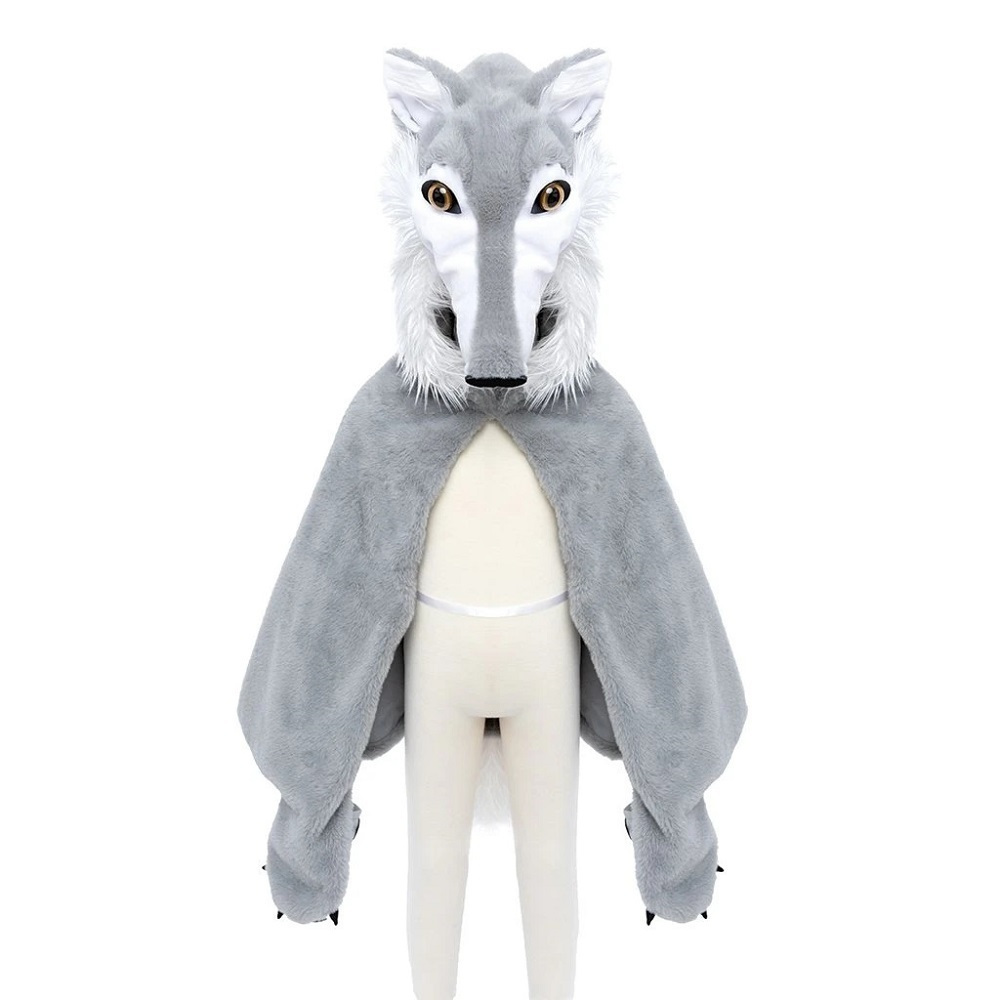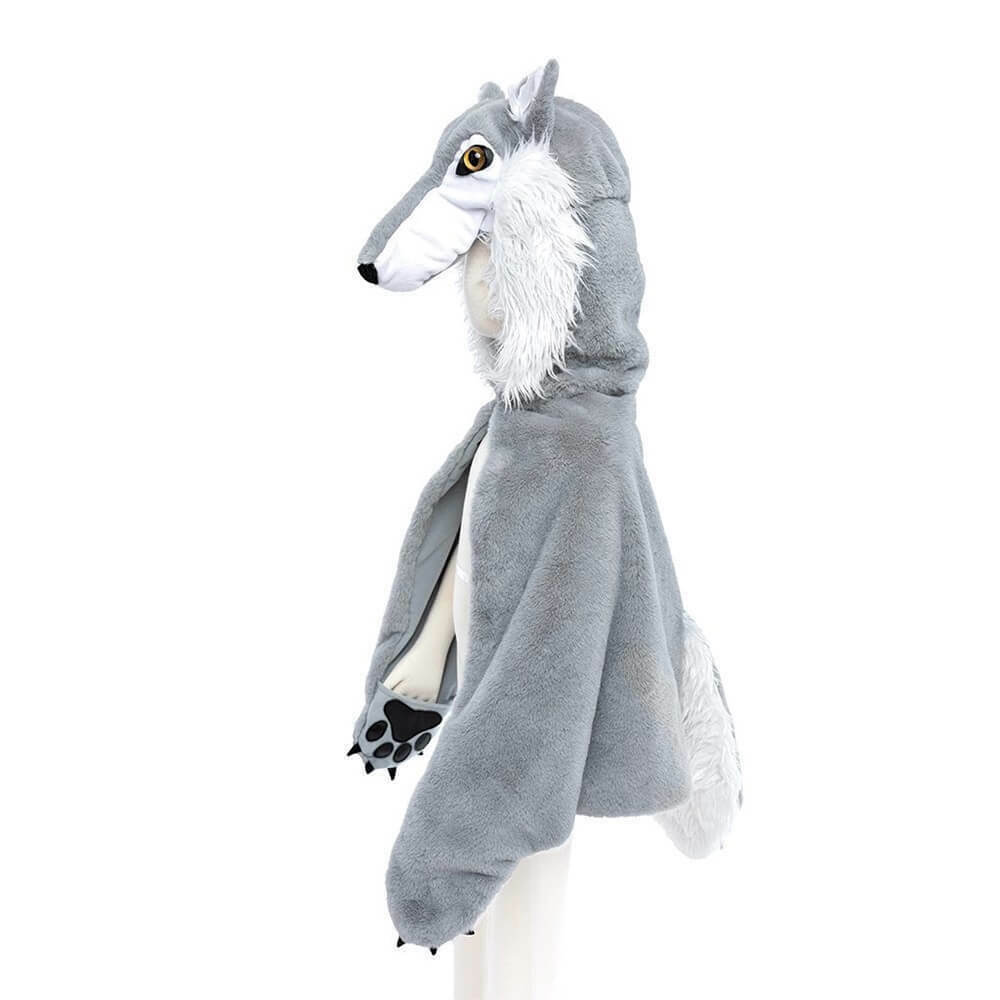 Λύκε, λύκε είσαι εδώ ? Μια γούνινη, απαλή και ζεστή κάπα που θα λατρέψουν οι μικροί μας φίλοι και θα χαρίσει ατελείωτες ώρες παιχνιδιού και φαντασίας! Το ρεαλιστικό κεφάλι του λύκου συμπληρώνεται από λευκή γούνα γύρω από τον λαιμό και την ουρίτσα καθώς και ενσωματωμένες πατούσες που χάρη στα μικρά λαστιχάκια επιτρέπει ακόμα και στα πιο μικρά χεράκια να τις φορέσουν.