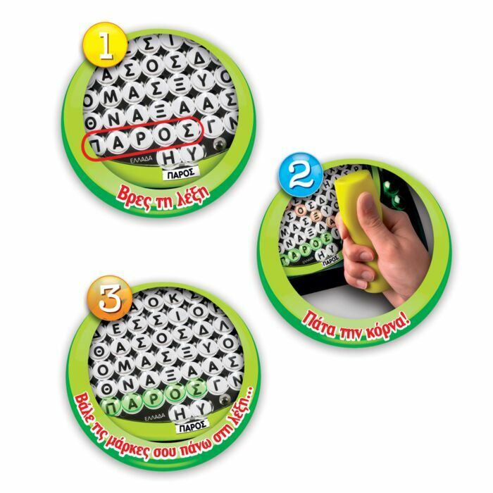 Το πιο γρήγορο και διασκεδαστικό κρυπτόλεξο για πολλούς παίκτες! Γυρίστε τον διάφανο δίσκο για να αποκαλύψετε τη νέα λέξη. Βρες τη λέξη πρώτος, πάτα την κόρνα και τοποθέτησε τις μάρκες σου πάνω της. Κάνε γρήγορα! Αν κάποιος παίκτης βρει μία λέξη που συνδέεται με τα γράμματα μίας δικής σου λέξης, θα αφαιρέσουν μερικές από τις μάρκες σου.