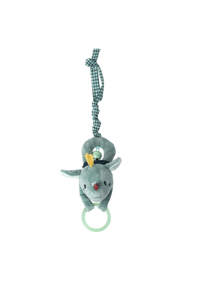 Μαλακό παιχνίδι κουδουνίστρα σε πράσινες αποχρώσεις με πολύχρωμες λεπτομέρειες και σχέδιο με ζωάκι από την εταιρεία Lilliputiens. Είναι κατασκευασμένη από 100% πολυεστέρα και το σχοινάκι από 100% βαμβάκι.