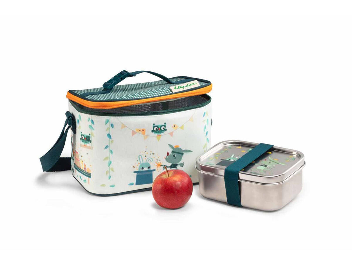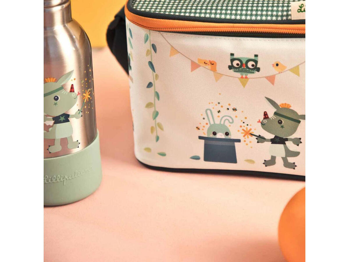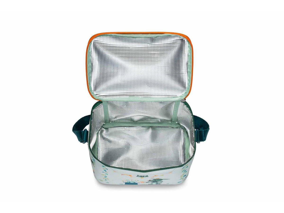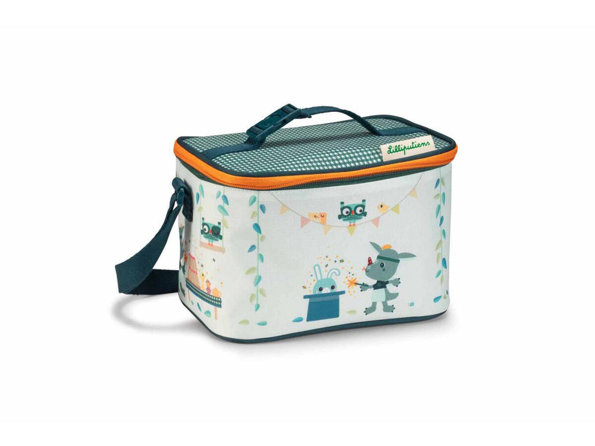 Ισοθερμική τσάντα φαγητού σε γαλάζιο φόντο με πολύχρωμες λεπτομέρειες και παιδικές φιγούρες σχέδιο από την εταιρία Lilliputiens.