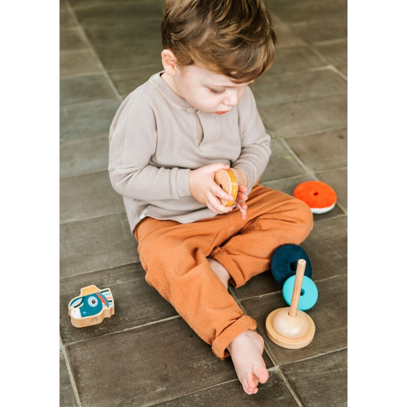 Κατασκευασμένο από διαφορετικά υλικά, αυτή η πρωτότυπη και χαρούμενη πυραμίδα ταξινόμησης αναπτύσσει τις λεπτές κινητικές δεξιότητες των μικρών μας φίλων.