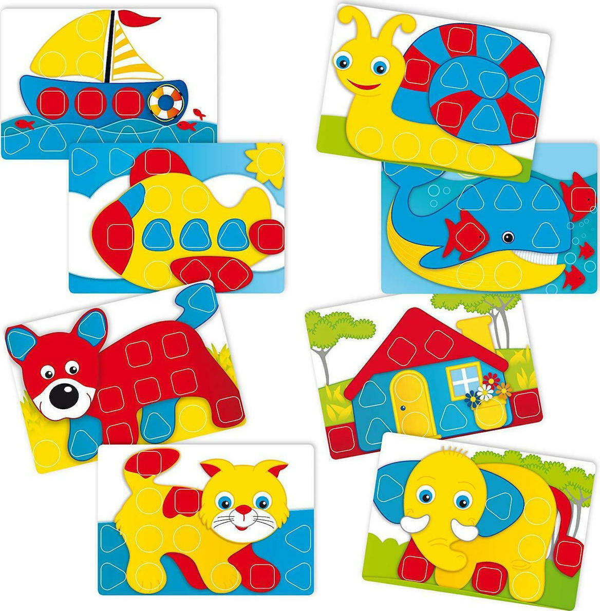 Με τα μεγάλα, πολύχρωμα κομμάτια σε σχήμα κύκλου, τετραγώνου ή τριγώνου, τα παιδιά θα μπορούν να αναπαράγουν τις εικόνες στους φωτεινούς κοπτήρες. Τα κομμάτια είναι πολύ εύκολα στην τοποθέτηση και παραμένουν σταθερά στη θέση τους.