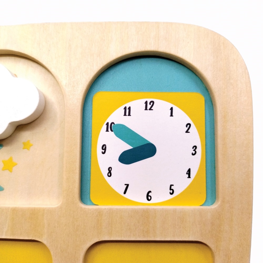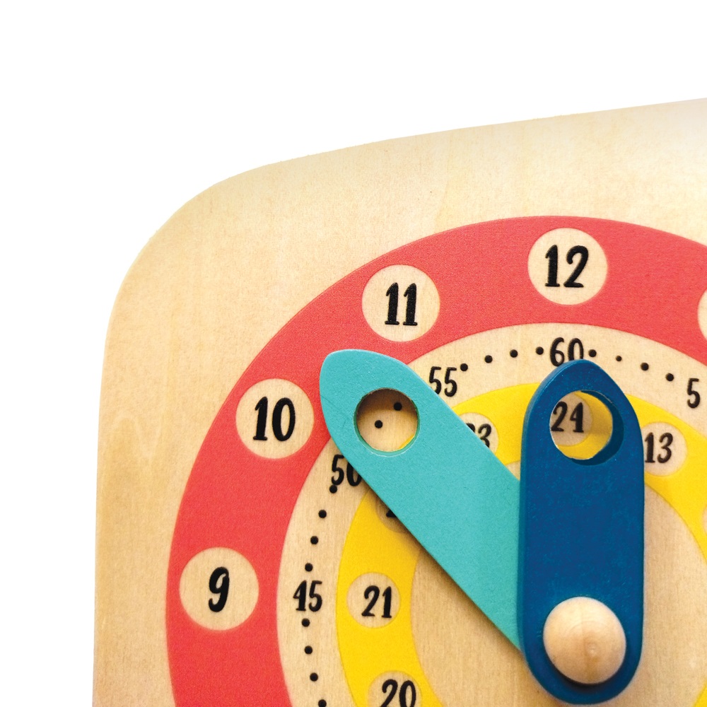 Ξύλινο εκπαιδευτικό παιχνίδι ‘Μαθαίνω την Ώρα’ από την ελληνική εταιρεία Svoora. Ενθαρρύνει τα παιδιά στην πρώτη επαφή τους με την ώρα και τις έννοιες της με ευφάνταστο, εύκολο και δημιουργικό τρόπο. Η αναλογική μορφή με τους δύο δείκτες και η ψηφιακή μορφή με τα 15 πλακίδια αριθμών εκπαιδεύουν τα παιδιά στην ανάγνωση του ρολογιού, ώστε να δίνουν σωστές απαντήσεις στη δημοφιλή ερώτηση ‘Τι ώρα είναι’. Το περιστρεφόμενο συννεφάκι τα εξοικειώνει με τις έννοιες της προ- και μετά- μεσημβρίας. Οι 24 κάρτες που περιέχονται στη συσκευασία, παρουσιάζουν διάφορες ώρες και με τις δύο μορφές τους, ενώ οι διαφορετικοί χρωματισμοί τους αντιστοιχούν στα 4 τμήματα της ημέρας: το πρωί, το μεσημέρι, το απόγευμα και το βράδυ. Το παιχνίδι είναι κατασκευασμένο αποκλειστικά από ξύλο οξιάς και κόντρα-πλακέ, χωρίς αιχμηρά σημεία και με λείες επιφάνειες για απόλυτα ασφαλή χρήση. Τα ζωηρά του χρώματα είναι μη τοξικά και σε συνδυασμό με τα χαρούμενα μοτίβα, εξάπτουν τη φαντασία! Περιέχει 2 ξύλινα κομμάτια στήριξης για παίξιμο στο γραφείο ή το τραπέζι, μία επεξηγηματική κάρτα με όλους τους πιθανούς συνδυασμούς ημέρας και ώρας, βαμβακερή θήκη αποθήκευσης. Κατάλληλο για ηλικίες 3 ετών και άνω. Διαστάσεις: 32 x 18 x 1 εκ.